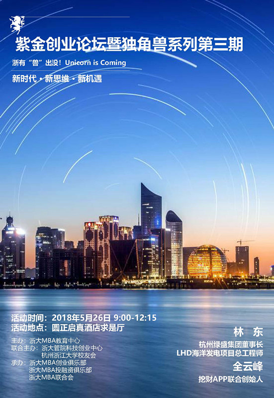 本次紫金创业论坛暨走近独角兽系列活动由MBA中心主办,浙大MBA投融资俱乐部、浙大MBA创业俱乐部承办,ZTVP作学术支持,旨在通过邀请独角兽企业创始人及资深创业投资人做主旨分享讲座,从创业、创投两大角度现场解读独角兽的奥秘。与此同时,校企联动、乃至校企联姻,将为我们浙大MBA师生提供全新视角,带来新思维,打造新局面。