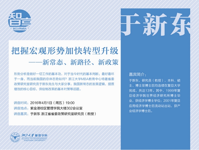 形势分析是做好一切工作的基本功,对于当今时代的基本判断:最好最坏于一身,而当前我国的总体态势如何?浙江大学MBA教育中心特邀省委政策研究室研究员于新东先生与大家分享:我国新常态的发展逻辑,提质增效的核心目标,供给制改革的基本对策等话题。