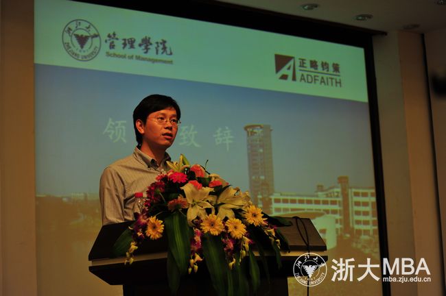 浙江大学MBA教育中心主任寿涌毅教授出席并代表学院致欢迎词。他指出:“浙江大学管理学院一直致力于走在市场经济的前面,我们不仅要走在市场经济的前沿,我们还要培养能够引领中国社会健康成长的力量。那么这些力量来自于那里?我们一直觉得最重要的力量就是人才,就是人力资源。”“从浙江大学MBA教育角度来讲,我们一直致力于怎样更好的服务于浙江省、长三角、乃至全国和全世界的经济发展。人力资源管理一直是浙大MBA关注的领域。我们也一直致力于把人力资源管理打造成为一个非常有特色的MBA方向。” 最后寿主任再次感谢在座的嘉宾以及浙大MBA的校友和同学。