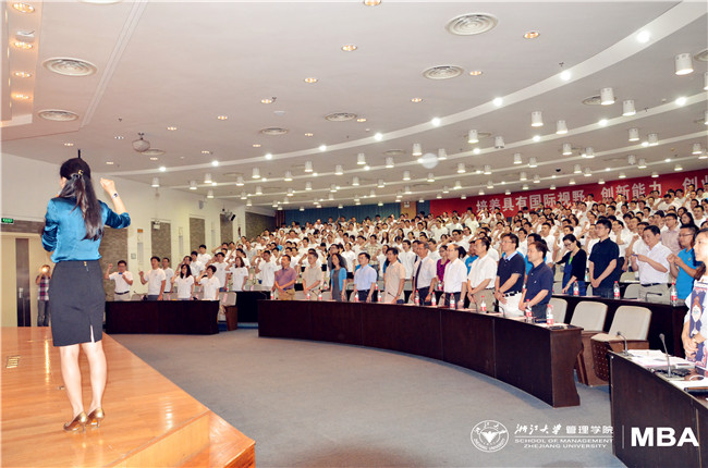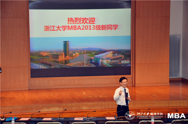 在全体MBA新生大合影后,浙大MBA中心主任寿涌毅老师为大家做了详细的项目介绍。寿老师生动地将MBA学生和MBA中心的关系比作加盟关系,希望可以通过大家的共同努力,实现共赢。寿老师详细地向大家介绍了管院的师资水平,项目排名,2013级的同学的生源、职业分布情况等。对中心的课程设置、选修课选课方式、中心的品牌活动、国际交流活动也进行了详细地介绍。最后,寿涌毅老师向在座的新生们提出了几点建议和希望,希望大家能够处理好生活、工作于学习之间的关系,努力培养MBA的全局观、领导力和执行力。