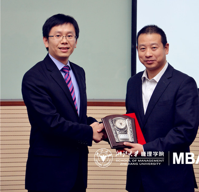 讲座结束后,董战略先生接过了浙大MBA中心主任寿涌毅副教授亲自颁发的浙江大学MBA研究生企业导师聘任证书。随着全球化趋势的加剧,越来越多的跨国并购案正在全球范围上演,中国作为全球最活跃的经济体,每天都有并购案发生,然而如何才能实现如赛博与苏泊尔般的融合?中国应当如何培养具有跨国并购专业知识的企业管理人才?相信董总未来在浙江大学MBA的课堂里,将有机会与同学们进行深入的交流。