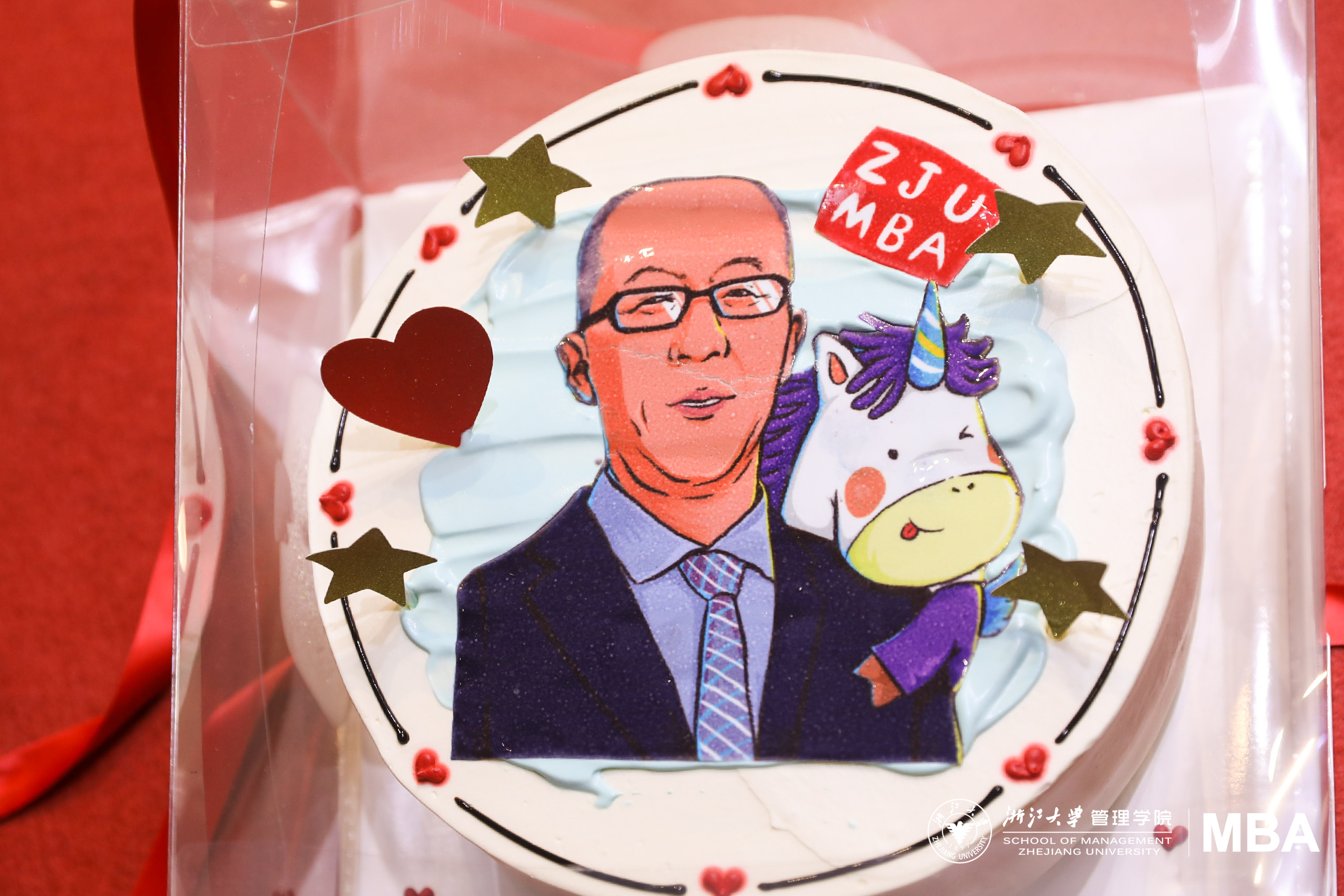 今年是浙江大学MBA项目成立25周年,活动当天也恰逢浙大MBA教育中心首届主任、管理学院贾生华教授57岁生日,由贾生华教授的学生推上了有贾生华教授漫画形象的蛋糕,全体为贾生华教授共唱生日歌庆生,场面洋溢着满满的温馨与感动,为整场晚宴增添了一抹别样的色彩。